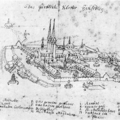 «Das fürstliche Kloster Einsidlen». Federzeichnung um 1700, vor den barocken Neubauten. Foto: Graphische Sammlung der ETH Zürich (Ausschnitt). Mehr als 850 Jahre lang, von 979 bis 1834, spielte das Kloster…