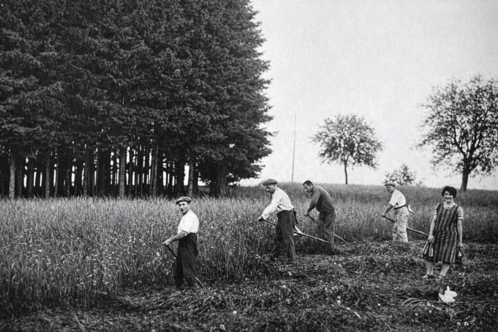 Gemeinsames Mähen in Brütten mit Sense um 1920. Die Heuernte begann jeweils um 3 bis 4 Uhr. Frauen, Kinder und Jugendliche brachten Essen und Trinken für die Pausen und halfen beim Heuwenden und Abtransport. (Bild: Hansueli Kägi)